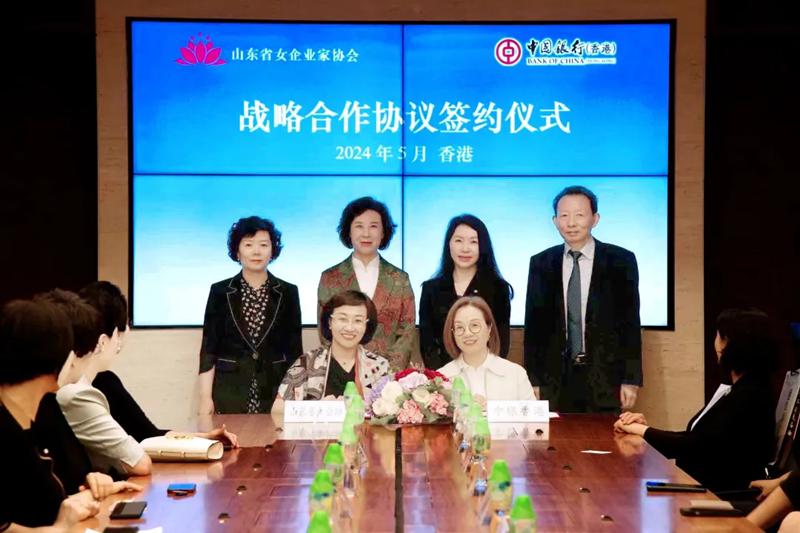 5月28日,代表團一行參訪中國銀行(香港)有限公司,山東省女企業家協會與香港中銀簽訂戰略合作協議,共同推動在金融、貿易、投資等領域的合作,開啟海岱齊魯與東方明珠巾幗合作新篇章。孫豐華表示,隨著全球經濟一體化的加速推進和“一帶一路”倡議的深入實施,魯港兩地的經貿合作將迎來更加廣闊的發展空間和機遇。此次簽約是山東省婦聯助力女企業家走向國際化的重要一步,也是山東省女企業家協會在香港開展經貿合作的重要成果。希望雙方能夠以此次合作為契機,進一步拓寬合作領域,深化合作內涵,實現互利共贏。中國銀行(香港)有限公司副總裁李彤表示,此次與山東省女企業家協會簽訂戰略合作協議,對雙方長期友好合作具有裏程碑意義。中銀香港將一如既往地支持山東省女企業家在港及海外市場的業務拓展,為她們提供更加優質、專業的金融服務,助力更多山東巾幗企業在國際化道路上勇攀高峰、創造輝煌。
